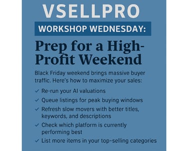 Below is your full Black Friday Weekend Prep Guide to help you list smarter, sell faster, and increase your profits — with VSELLPro doing most of the heavy lifting.